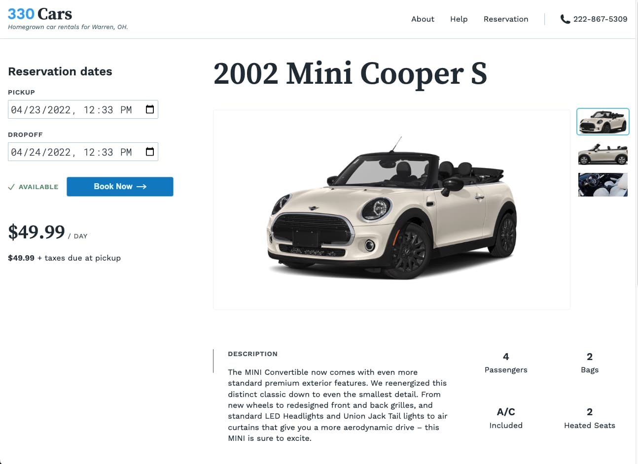 My sister runs a small used car lot in Akron called Her Cars. She has been exploring the possibility of starting up a rental car business out of it, and asked if I could help figure out how that might work. dev.330-cars.com is the result of that exploration.