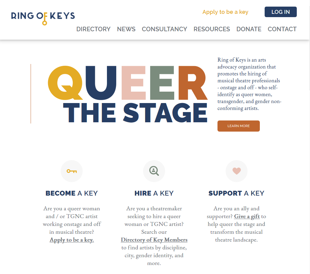 I helped build ringofkeys.org in early 2020 (right before the pandemic) and have been maintaining the site for the past 3 years. Ring of Keys is a 501c3 non-profit organization that helps empower, promote, and connect theatermakers that identify as queer women, non-binary, or trans.